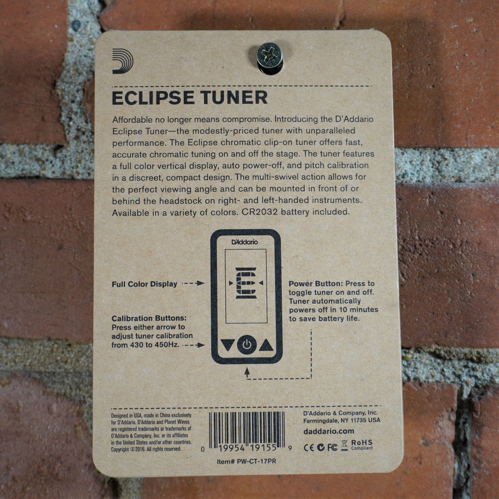 Affordable no longer means compromise. Introducing the D’Addario Eclipse Tuner—the modestly-priced tuner with unparalleled performance. The Eclipse chromatic clip-on tuner offers fast, accurate chromatic tuning on and off the stage. The tuner features a full color vertical display, auto power-off, and pitch calibration in a discreet, compact design. The multi-swivel action allows for the perfect viewing angle and can be mounted in front of or behind the headstock on right- and left-handed instruments. Available in a variety of colors. CR2032 battery included.