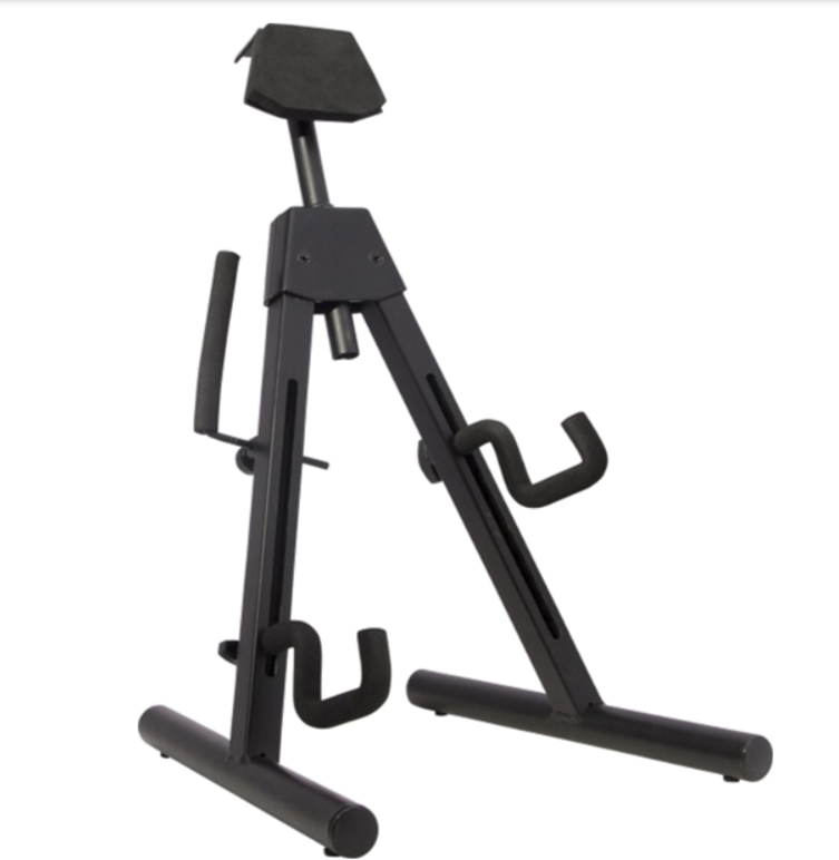 Fender's Universal "A"-Frame Electric Stand for electric guitars and basses is the first of its kind, designed to hold not only offset instruments such as the Fender Jazz Bass and Jazzmaster guitar, but also instruments with more extreme shapes such as the Jackson Rhoads and Kelly models. Features include a height-adjustable padded body rest, dual adjustable yokes and an adjustable retainer arm for securing instruments in place.